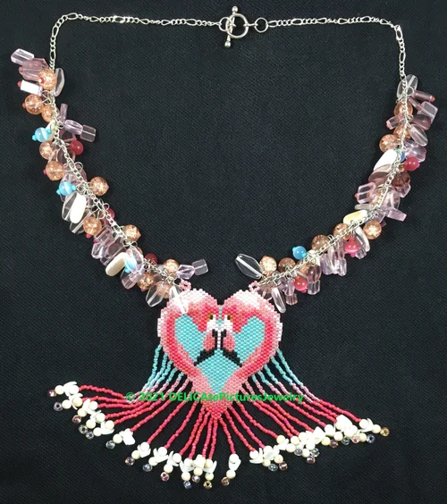 This gallery features Myuki Delica glass cylinder beaded picture style necklaces and pendants that are themed around animals, reptiles, fish, and other creatures. Each piece is for sale unless otherwise noted. Prices are negotiable. Inside, you’ll find tigers, wolves, gorillas, chameleons, toucans, flamingoes, macaw parrots, eagles, cobra snakes, horses, zebras, killer orca whales, clown fish, and white swans.