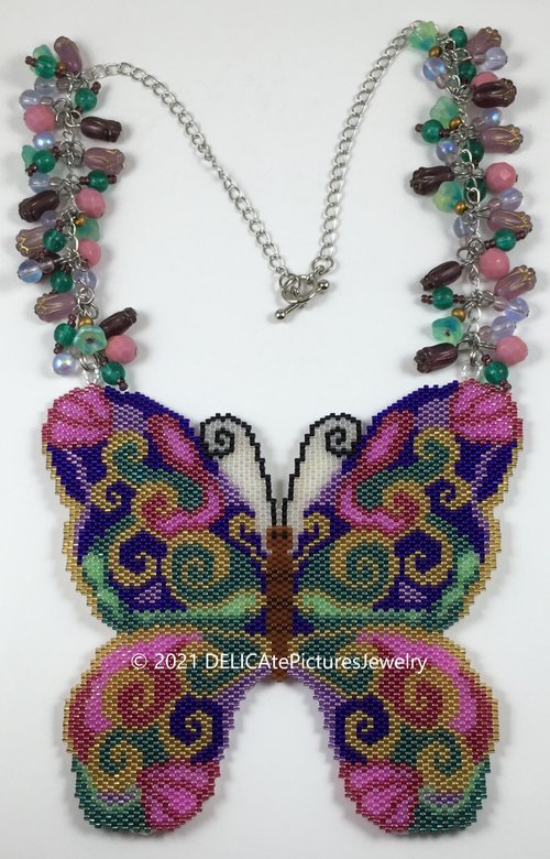 This gallery features two categories, freeform and netted lace, of glass beaded necklaces and amulet purses. Made with Miyuki Delicas glass cylinder beads, Czech glass seed beads, various Swarovski crystals, Czech pressed glass shapes like flowers, leaves, fruits (cherries & pineapples), animals (elephants), and insects (ladybugs). Each piece is for sale unless otherwise noted. Prices are negotiable.