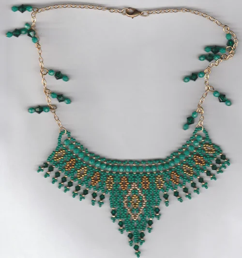 One Peach Poppy Floral Garden (jade chips) necklace available on eBay. This was my first. Miyuki Delica beaded bib style Peach Poppies necklace. Strap is 11” beaded with green African jade chips and a silver-tone lobster claw closure and an extender chain.